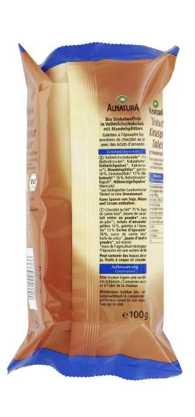 Knusprig-schokoladig und in Bio-Qualität. Für diese Taler werden Dinkelwaffeln großzügig mit Vollmilchschokolade und knackigen Mandelsplittern überzogen – für die Kaffeetafel und andere besondere Momente.