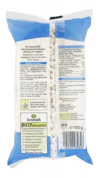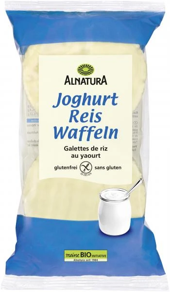 Glutenfrei naschen und genießen: gepuffter Vollkornreis mit feinem Joghurtüberzug. Die Alnatura Joghurt-Reiswaffeln sind ein knuspriger Leckerbissen mit süßlich-frischer Joghurtnote. Sie schmecken als Nachtisch ebenso gut wie einfach zwischendurch. In Bio-Qualität. Tipp: Belegt mit Früchten der Saison, wie Erdbeeren, Bananen oder Pflaumen, sind sie ein besonderer Genuss.
