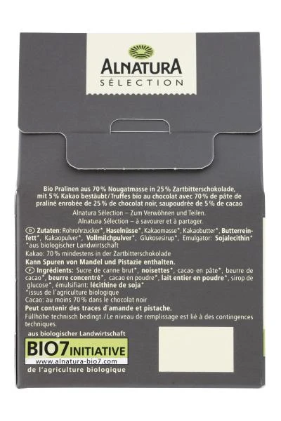 Dass Belgien seinen Ruf als Paradies für alle Fans feiner Schokoladenprodukte zu Recht trägt, beweisen diese Pralinen. Die Alnatura Sélection Trüffel bestehen aus einer aromatischen und zartschmelzenden Haselnussnougatmasse, umhüllt von Zartbitterschokolade und bestäubt mit hervorragendem Kakao. Aus hochwertigen Bio-Zutaten in Belgien hergestellt sind sie perfekt zum Verwöhnen und Teilen.