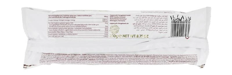 Goldbraune, von körnigknackigem Hagelzucker gekrönte Feingebäckringe mit Schokolade überzogen. Ofenfrisch verpackt.