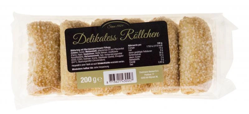 | Blätterteigröllchen mit Marzipangeschmack-Füllung. | Zucker, WEIZENMEHL, pflanzliches Öl und Pflanzenfett (Palm, Raps), SOJABOHNEN, Weiße Bohnen, modifizierte Kartoffelstärke, HARTWEIZENMEHL, Salz, Konservierungsmittel (E202, E282), Dextrose, Aroma, Stabilisator (Sorbit), Emulgator (E471), Säuerungsmittel (Citronensäure). Hergestellt in einer Fabrik wo auch SCHALENFRÜCHTE verarbeitet werden. |