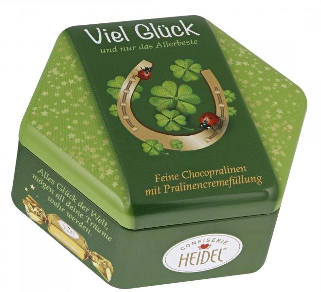Geschenkdose „Viel Glück“ gefüllt mit leckeren Chocopralinen mit Pralinencremefüllung.