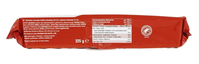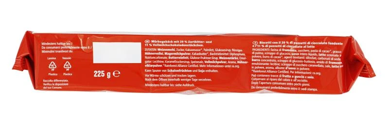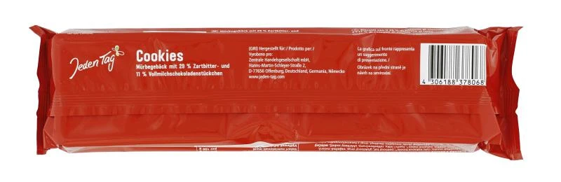 Mürbegebäck mit 29% Zartbitter- und 11% Vollmilchschokoladenstückchen.