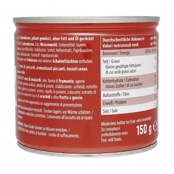 Cashewkerne, pikant gewürzt, ohne Fett und Öl geröstet.