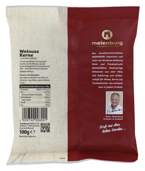 Die Energiebündel unter den Nusskernen, mit einem von Natur aus sehr hohem Gehalt an mehrfach ungesättigten Fettsäuren sowie Ballaststoffen. Für eine ganzjährige Frischegarantie werden die Walnüsse aus den besten Anbaugebieten in Frankreich und Chili bezogen – mit zeitversetzten Erntezeiten. Die Walnüsse sind besonders große helle Nusskerne mit einem milden angenehm-herben Geschmack.