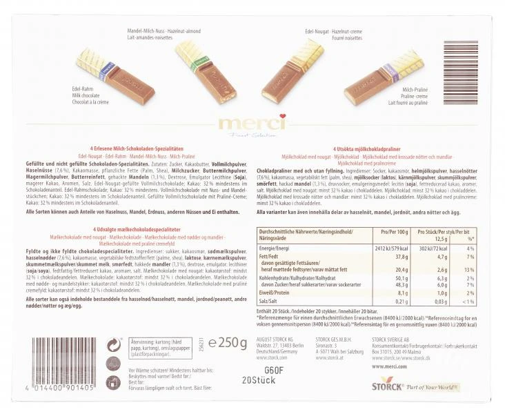 Merci Helle Vielfalt mit 4 erlesenen Milch-Schokoladen-Spezialitäten. Feinste Milch-Schokoladen für Genießer: Edel-Rahm, Mandel-Milch-Nuss, Edel-Nougat und Milch-Praliné.