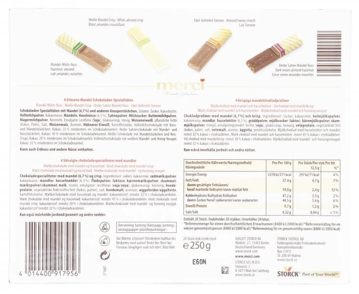 Vollmilchschokolade mit Nuss- und Mandelstückchen: 32% mindestens, Herbe Sahneschokolade mit Mandelstückchen: 45% mindestens, Weiße Schokolade mit Mandelstückchen und Reis-Crisps: 28% mindestens, Vollmilchschokolade mit weißem Mandel- und Honig-Nougat: 32 % mindestens im Schokoladenanteil