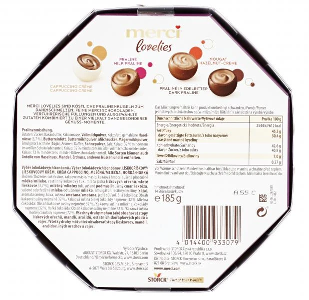 Feine Auswahl mit zartschmelzenden Füllungen für Genießer in vier leckeren Geschmacksrichtungen: Praliné, Cappuccino Crème, Nougat, Praliné in Edelbitter.