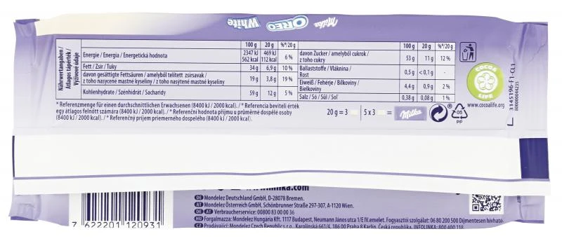 Milka Oreo White ist der zartschmelzende Schokoladengenuss aus weißer Milka Schokolade und knusprigen original Oreo Keksstückchen.