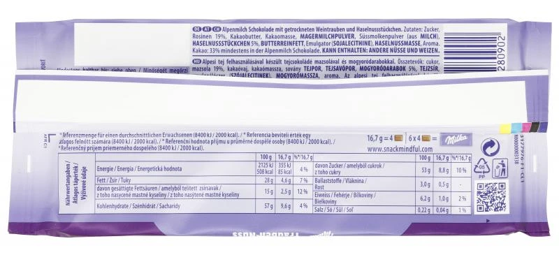 Milka Trauben-Nuss ist der zartschmelzende Schokoladengenuss aus Alpenmilch Schokolade aus 100% Alpenmilch mit fruchtigen Trauben- und feinen Haselnussstückchen.