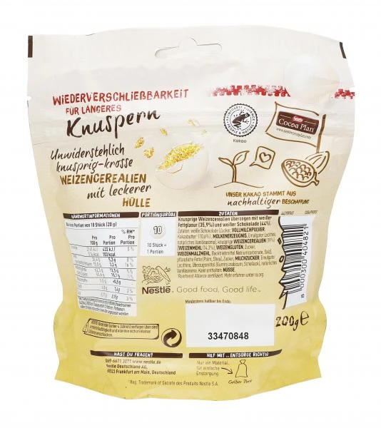 Knackige Weizencerialien und weiße Schokolade – das ist die unwiderstehliche Mischung der Nestlé Choco Crossies Crunchy Balls Weiß. Der knusprig-krosse Kern mit Weizencerealien in Kombination mit einer Schicht zartschmelzender, weißer Schokolade macht jede Knusper-Kugel zu einem einzigartigen Crunch-Erlebnis. Lass es knuspern.