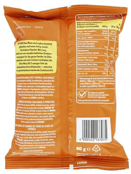Die luftig-leichten Pom-Bär Ofen Minis überzeugen mit 50% weniger Fett als herkömmliche Kartoffelsnacks. Denn sie sind gebacken, nicht frittiert und haben daher 50% weniger Fett als herkömmliche Kartoffelsnacks und bieten maximalen Genuss.