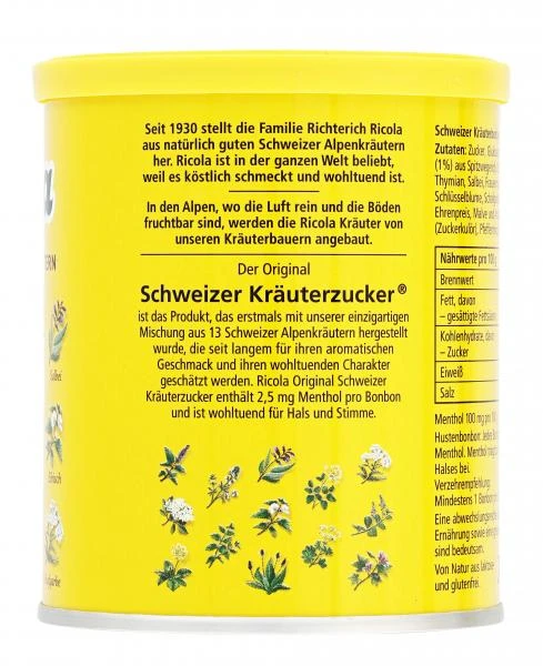 Ob rund oder eckig, ohne oder mit Zucker – der Klassiker ist beliebt. Der Geschmack: Vertraut, wohltuend und angenehm frisch. Die Rezeptur für den Original Kräuterzucker ist seit 1940 nahezu unverändert und streng geheim, aber so viel sei verraten: Seine Kraft kommt aus den wohltuenden und sorgsam miteinander kombinierten 13 Schweizer Alpenkräutern – Spitzwegerich, Eibisch, Pfefferminze, Thymian, Salbei, Frauenmantel, Holunderblüten, Schlüsselblume, Schafgarbe, Bibernelle, Ehrenpreis, Malve und Andorn – die das Herz eines jeden Ricola Bonbons bilden.