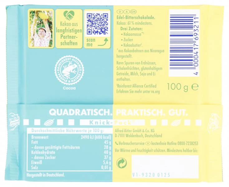 Wenn du noch zu denen gehörst, die glauben, dass Glück nicht auf Bäumen wächst, hast du DIE FEINE mit 61% Kakao noch nicht probiert. Natürlich wächst nicht die ganze Tafel auf Bäumen, aber die Früchte, aus denen Ritter Sport die 100% zertifiziert nachhaltigen Kakao gewinnen.