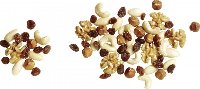 Nicht nur der Name der beliebten Mischung aus Nüssen und Trockenfrüchten, sondern auch ihre einzelnen Komponenten sind unverwechselbar: Das Studentenfutter vereint knackige Haselnusskerne, feine Cashewkerne, aromatische Walnusskerne, süßliche Mandeln und fruchtige Rosinen zu einem Geschmackserlebnis.
