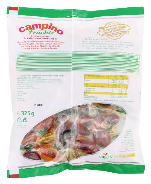 Fruchtbonbons in 4 Geschmacksrichtungen: Zitrone, Orange, Kirsche und Schwarze Johannisbeere. Klar, glatt und mit dem erfrischenden Geschmack leckerer Früchte – das sind Campino Früchte, der Frucht-Bonbon-Klassiker von Storck. Einfach ein echter Bonbon-Genuss.