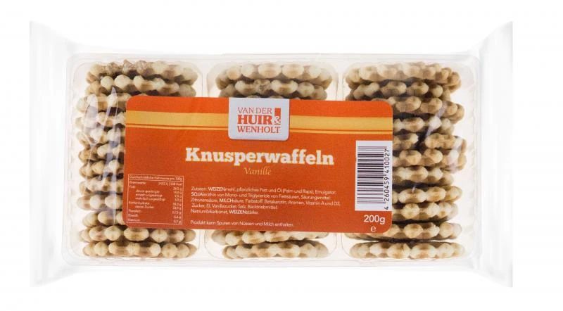 | Knusperwaffeln, Vanille. | WEIZENMEHL, pflanzliches Fett und Öl (Palm und Raps), Emulator, SOJALECITHIN von Mono- und Triglyceride von Fettsäuren, Säurungsmittel: Zitronensäure, MILCHSÄURE, Farbstoff: Betakarotin, Aromen, Vitamin A und D3, Zucker EI, Vanillezucker, Salz, Backtreibmittel: Natriumbikarbonat, WEIZENSTÄRKE. Produkt kann Spuren von NÜSSEN und MILCH enthalten. |